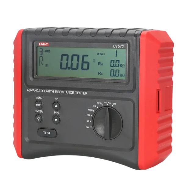 UT572 is for measuring earth resistance and soil resistivity. It can automatically check interface connection and detect interference voltage/frequency, with data hold and indication functions. It can perform 2/3/4-wire measurements for different on-site applications, such as power equipment wiring and lightning protection equipment.